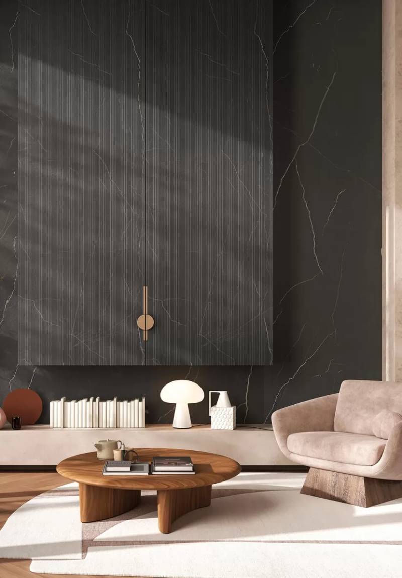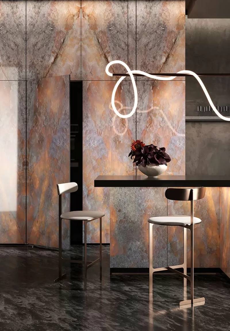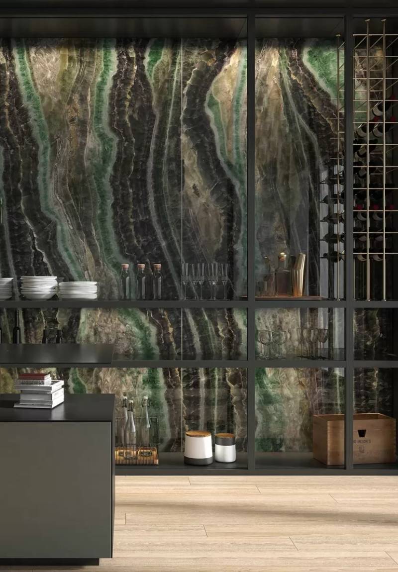 Ultra-thin architectural glass and aircraft-grade aluminum with high-definition digital textures and integrated LED backlighting.